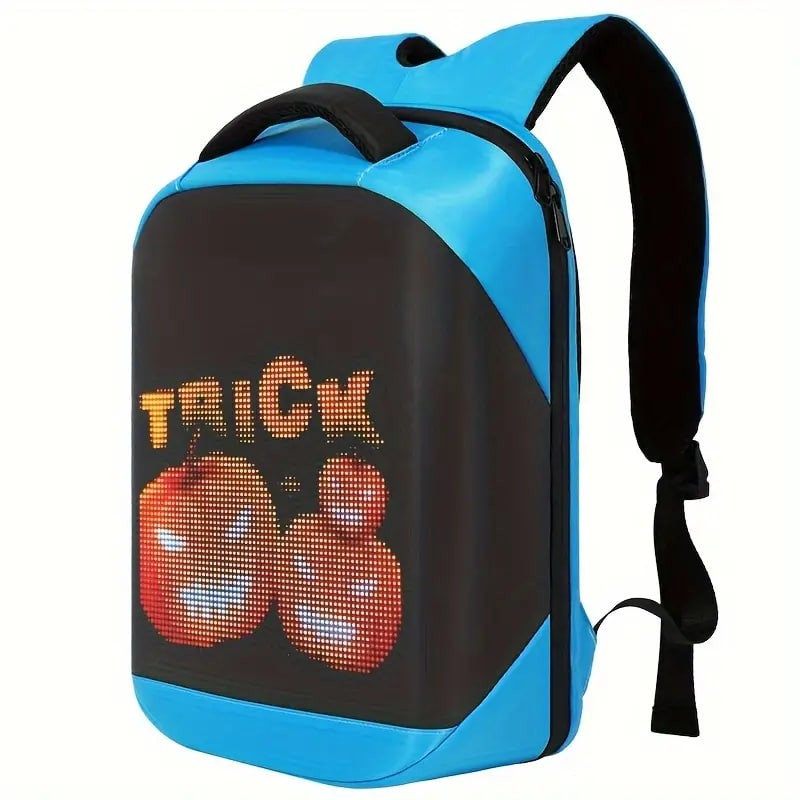 Product features: backpack with display screen, sense of technology, trend Highlight: smart APP control, wifi backpack Product category: pixel bag, smart backpack, pixel bag, led backpack 1: If you need to clean the backpack, please take out the screen to avoid water damage. 2: The mobile APP control can change the display of text and pictures, and the animation can be displayed in various ways. 3,Please noted that for transportation safety, we do not provide mobile power,backpack only.