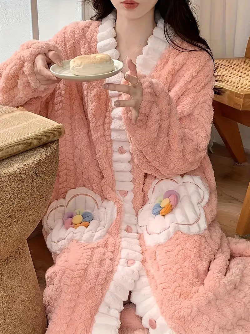 flower decor fuzzy night robe cute long sleeve v neck robe with pockets womens sleepwear details 3flower decor fuzzy night robe cute long sleeve v neck robe with pockets womens sleepwear details 3
