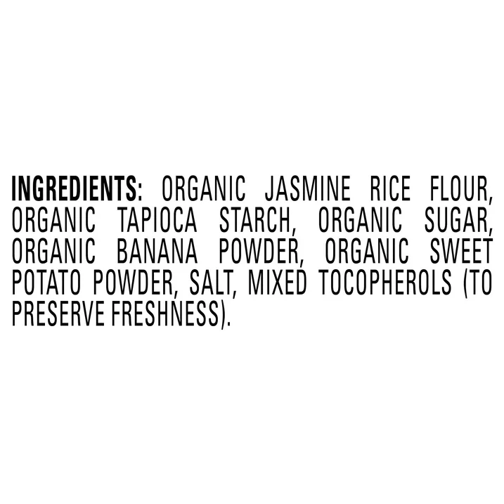 Ingredients Inclue: Organic Jasmine Rice Flour, Organic Tapioca Starch, Organic Sugar, Organic Banana Powder, Organic Sweet Potato Powder (see nutrition facts panel for full ingredients list)