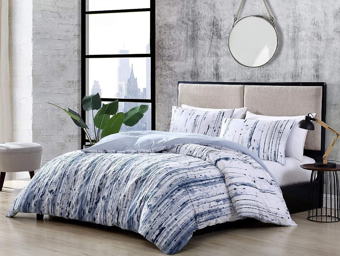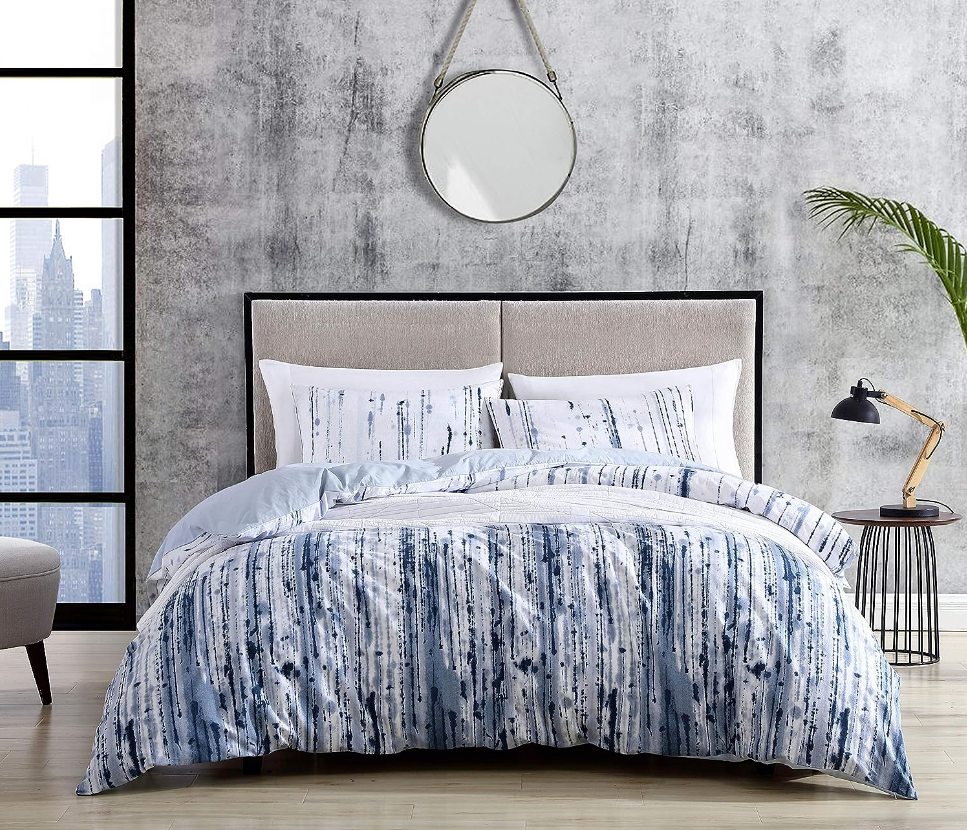 Update your bedding ensemble with the City Scene Sokal Comforter Set. Constructed with soft, prewashed cotton and featuring a bold, ink-dripped print in indigo, the Sokal Set is sure to give you the look of an artist’s studiowithout the mess. Comforter features a polyester fill and a solid light blue reverse. Set is machine washable for easy and convenient care.