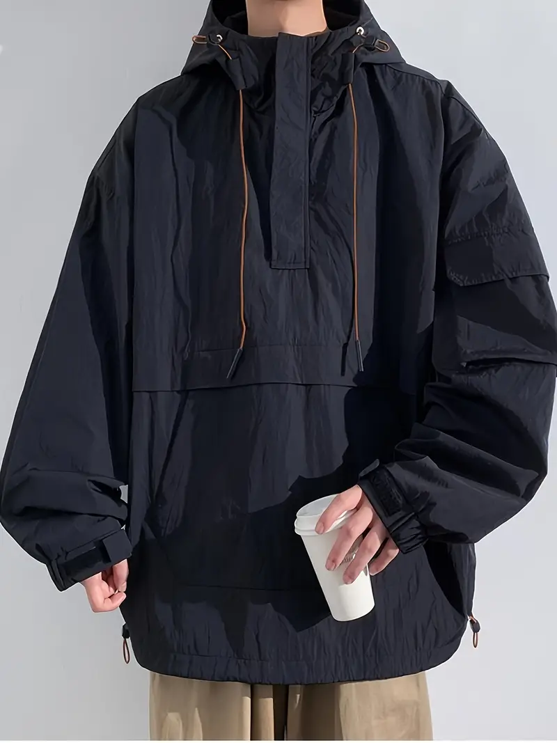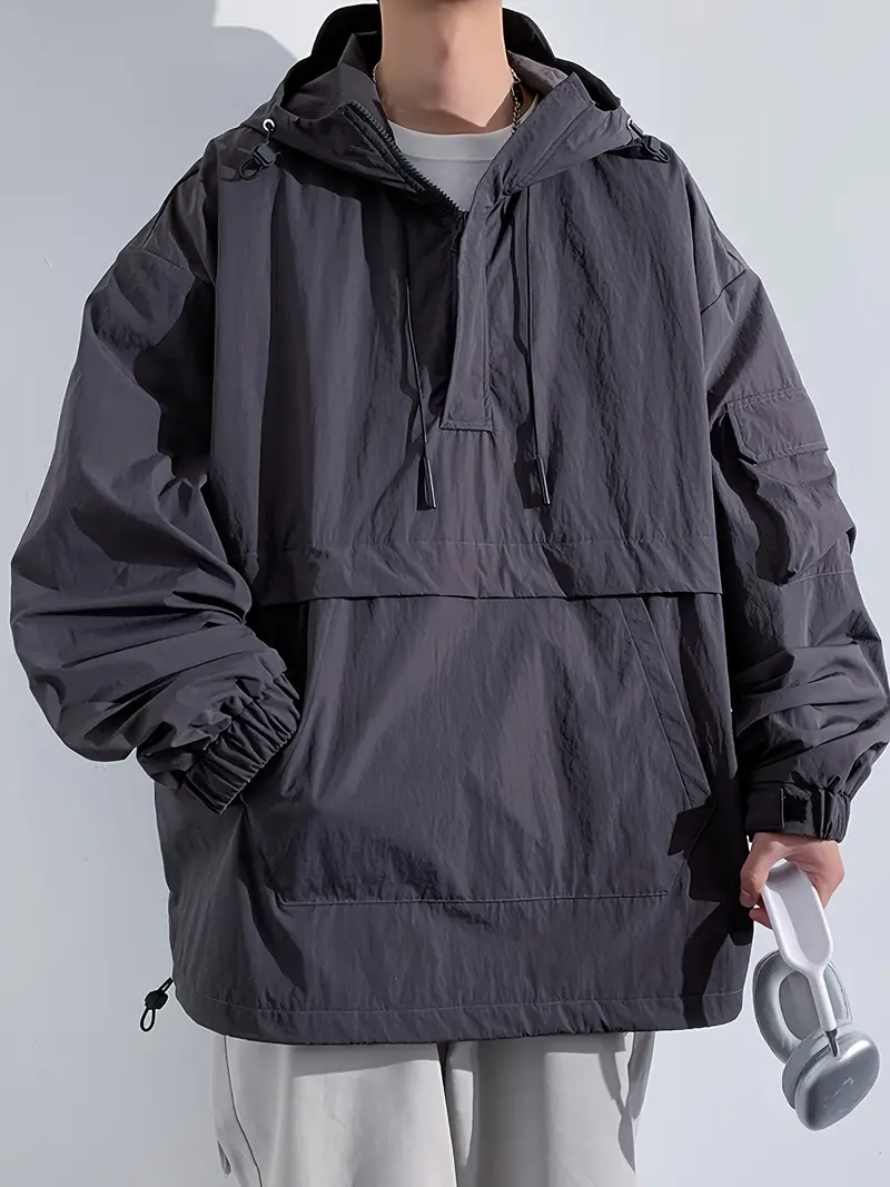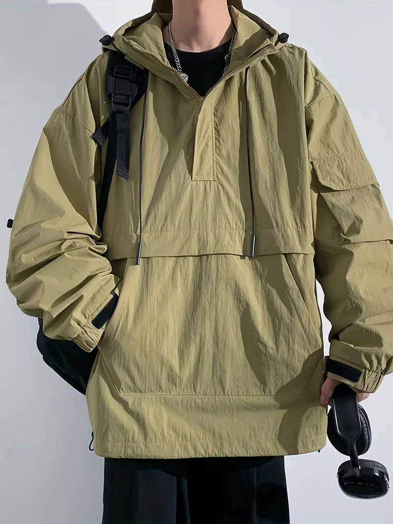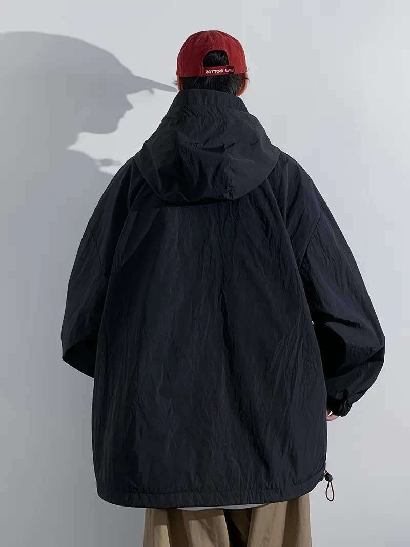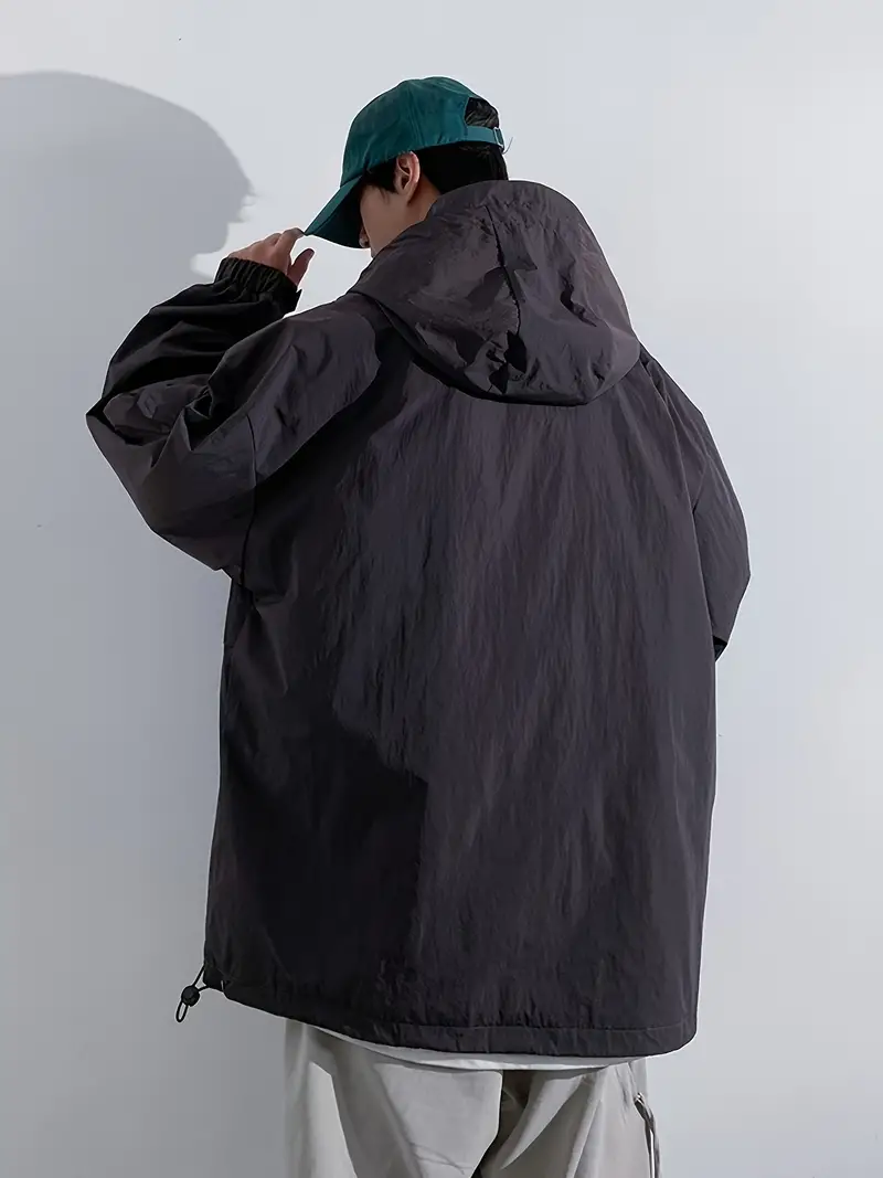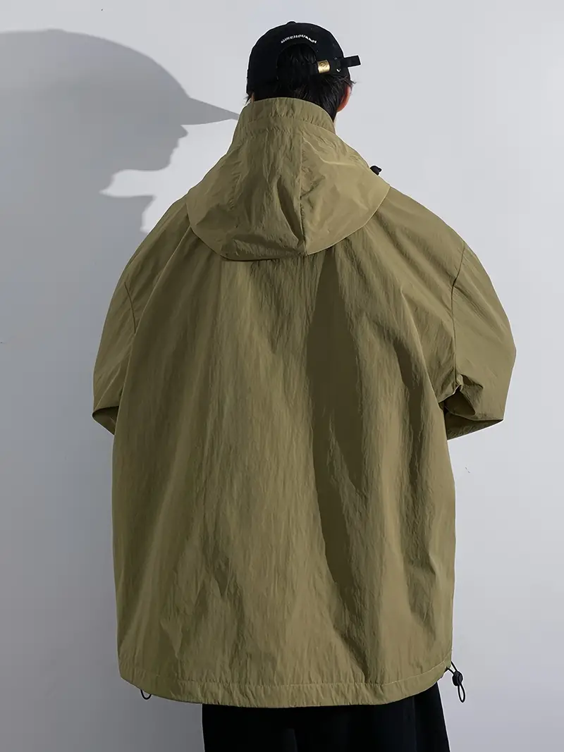Men's Stylish 100% Nylon Solid Windbreaker With Pockets, Active Breathable Lapel Zip Up Long Sleeve Hooded Jacket For Hiking Jogging Cycling Outdoor Fitness Workout