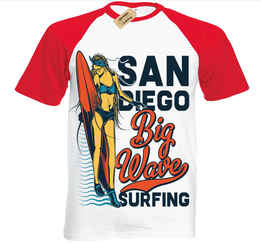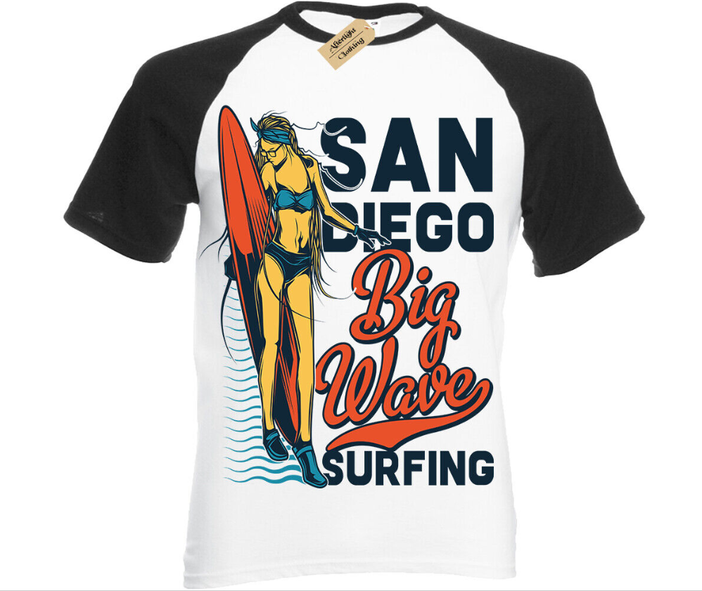 San Diego Big Wave Surfing T-Shirt Mens surf beach surfers Short Sleeve Baseball
