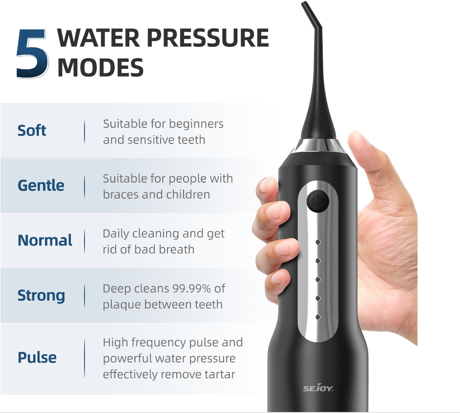 ?Soft Mode- Offer 1000 times/minute gentle pressure water pulse, 50PSI water pressure.Suitable for beginners and sensitive teeth.