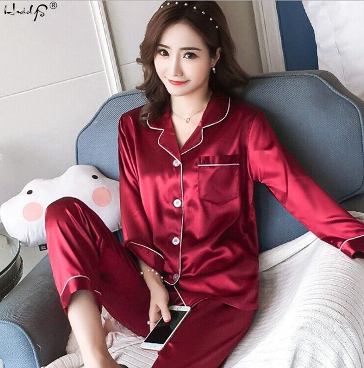 Women's Silk Satin Pajamas Set Long Sleeve Button-Down Sleepwear Nightwear Plus
