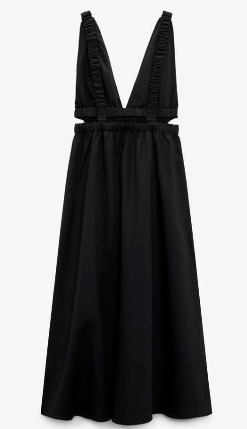 ZARA LINEN BLEND BLACK CUT-OUT V-NECK BLEND MIDI DRESS REF:4786/291
