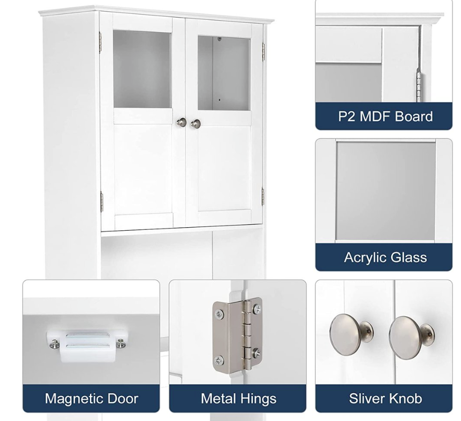 Introductions: This is a simple and modern style wall-mounted standing bathroom cabinet. Adopting high quality and hard MDF sheet, it is waterproof and moisture-proof. Double-door and three-layer design can help you classify your items better. You can put a variety of toiletries, cosmetics, and other sundries. In addition, the middle board in the double door can be movable and can be adjusted up and down according to your wishes. The space between below two feet is special to reserve for closes tool, which saves the floor area of the bathroom greatly and provides a perfect design plan for your bathroom. Specifications: Brand: FCH Material: MDF Color: White Chrome handle Dimensions: (23.23 x 8.66 x 66.93)" / (59 x 22 x 170)cm (L x W x H) Door's Interior Overall Dimensions: (21.46 x 7.09 x 22.44)" / (54.5 x 18 x 57)cm (L x W x H) In-between Layer Dimensions: (21.46 x 8.07 x 9.84)" / (54.5 x 20.5 x 25)cm (L x W x H) Size Between Legs: (21.46 x 8.07 x 30.31)" / (54.5 x 20.5 x 77)cm (L x W x H) Door Dimensions: (10.63 x 22.44)" / (27 x 57)cm (L x W ) Weight: 32.63 lbs / 14.8kg